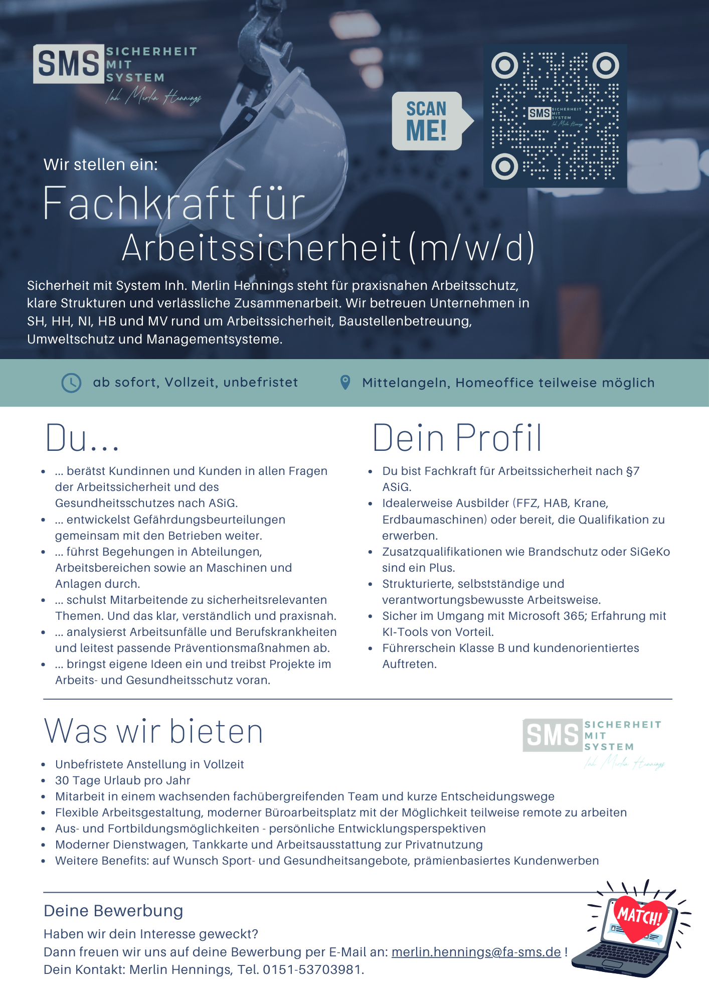 Sicherheit mit System, Inh. Merlin Hennings, steht für praxisnahen Arbeitsschutz, klare Strukturen und verlässliche Zusammenarbeit. Ausgangspunkt waren konkrete Nachfragen ehemaliger Kunden – heute unterstützen wir Unternehmen in Schleswig-Holstein, Hamburg, Niedersachsen, Bremen und Mecklenburg-Vorpommern dabei, Arbeitssicherheit, Baustellenbetreuung, Umweltschutz und Managementsysteme rechtssicher und alltagstauglich aufzubauen.